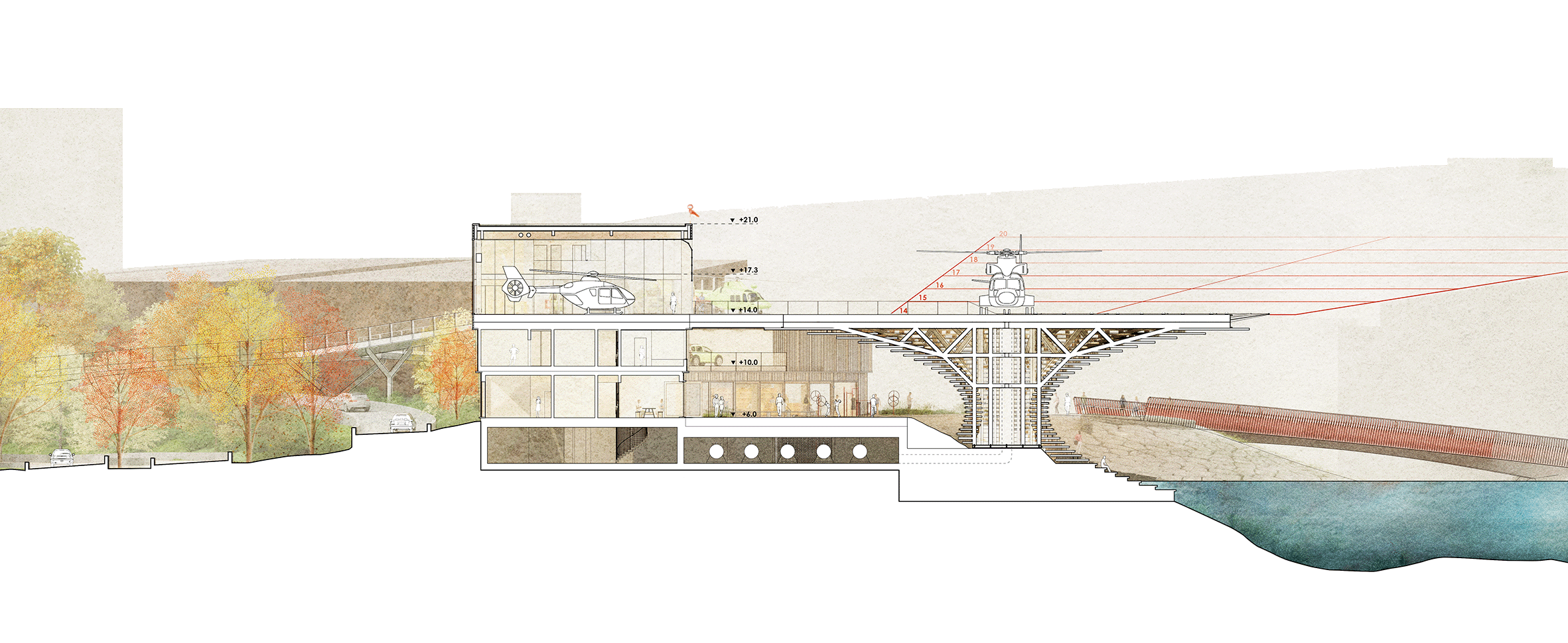The Lighthouse - The helipad or the helicopter’s arrival/departure on it is dramatised as a lighthouse. The helipad are placed in the front, clearly signalling the air medic’s societal mission of saving lives in critical danger. The platform as a sculptural lighthouse element complements well the sculpture trail on site.